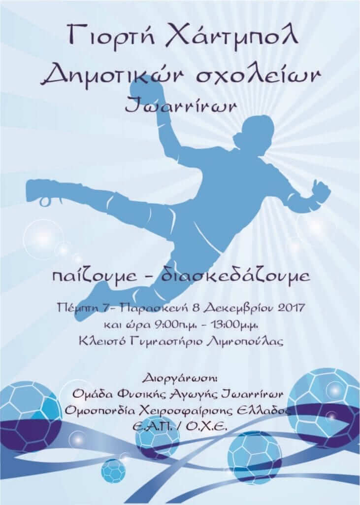 Στο κλειστό γυμναστήριο Λιμνοπούλας την Πέμπτη 7 και την Παρασκευή 8 Δεκεμβρίου (ώρες 09:00-13:00) θα πραγματοποιηθεί γιορτή χάντμπολ με την συμμετοχή μαθητών από τα Δημοτικά σχολεία των Ιωαννίνων και συγκεκριμένα από τις τάξεις Ε’ και ΣΤ΄