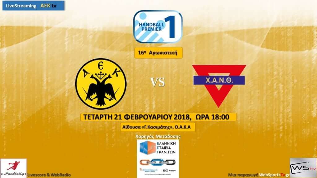 Οι φίλοι του χάντμπολ θα έχουν την ευκαιρία να παρακολουθήσουν τον αγώνα στην αίθουσα «Γ. Κασιμάτης» στο ΟΑΚΑ όπου η ΑΕΚ υποδέχεται την ΧΑΝΘ για την 16 αγωνιστική της Handball Premier (21/2, 18:00, live score από το e-handball.gr & Web Radio) ζωντανά μέσω live streaming από το e-handball.gr και το AEK TV σε παραγωγή του WebSports TV, με χορηγό της μετάδοσης την Ελληνική Εταιρία Γρανιτών.