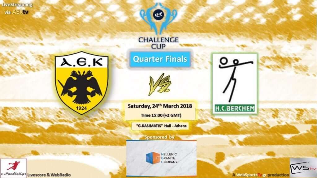Το e-handball.gr σε παραγωγή του WebSports Tv θα μεταδώσει σε live streaming την αναμέτρηση της ΑΕΚ με την Μπέρχεμ από το Λουξεμβούργο για την προημιτελική φάση του Challenge Cup από την αίθουσα «Γ. Κασιμάτης» του ΟΑΚΑ (24/3, 15:00, live score από το e-handball.gr), με την χορηγία του