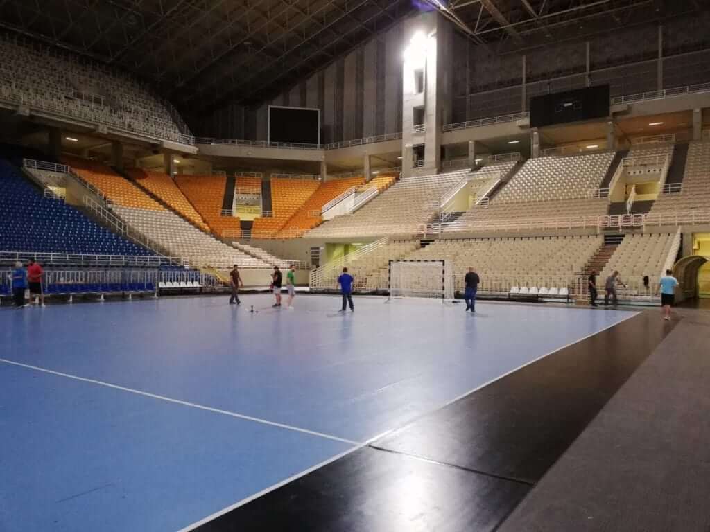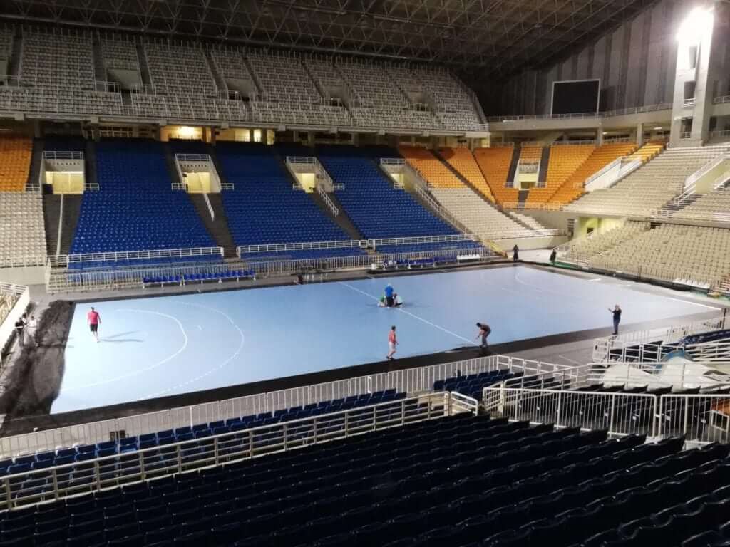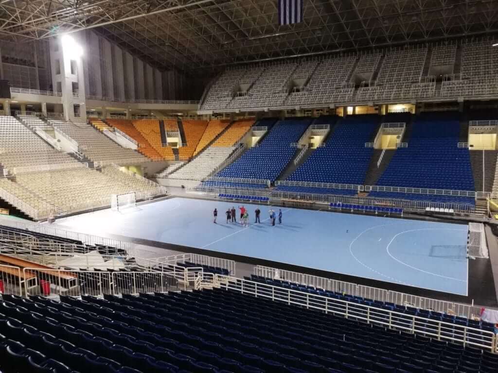 Αμέσως μετά τον αγώνα της ΑΕΚ με τον ΠΑΟΚ για τα play offs της Basketball League άρχισε η διαδικασία της τοποθέτησης του τάραφλεξ και όλων των απαραίτητων τροποποιήσεων ώστε το κλειστό «Νίκος Γκάλης» του ΟΑΚΑ να μετατραπεί από ένα γήπεδο μπάσκετ σε μια σύγχρονη αρένα χάντμπολ που θα την ζήλευαν και οι έχοντες την πρωτοκαθεδρία του αθλήματος, σε τέτοιου είδους γήπεδα, Γερμανοί.