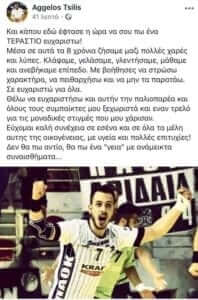 Θέλω να ευχαριστήσω και αυτήν την παλιοπαρέα και όλους τους συμπαίκτες μου ξεχωριστά και έναν τρελό για τις μοναδικές στιγμές που μου χάρισαν. Εύχομαι καλή συνέχεια σε εσένα και σε όλα τα μέλη αυτής της οικογένειας, με υγεία και πολλές επιτυχίες! Δεν θα πω αντίο, θα πω ένα “γεια” με ανάμεικτα συναισθήματα…» ήταν το μήνυμα του Τσίλη στο facebook.