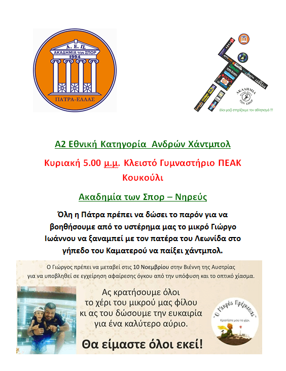 Στον αγώνα παράλληλα θα γίνει και μια κίνηση ανθρωπιάς εκ μέρους των αθλητών και μελών της Ακαδημίας των Σπορ και αντί εισιτηρίου, θα υπάρχει ένας κουμπαράς, όπου ο καθένας που θα εισέρχεται στον αγώνα από το υστέρημα του και θα βάζει μέσα όσα χρήματα μπορεί, για να μπορέσει ο μικρός Γιώργος Ιωάννου να μεταβεί στις 10 Νοεμβρίου στην Αυστρία και να υποβληθεί σε εγχείρηση για αφαίρεση όγκου από την υπόφυση και το οπτικό χίασμα για να μην εμποδίζετε πλέον η ανάπτυξή του. Η όλη προσπάθεια στηρίζεται και θα γίνει μέσω της ΜΚΟ “ο Μικρός Πρίγκιπας”.