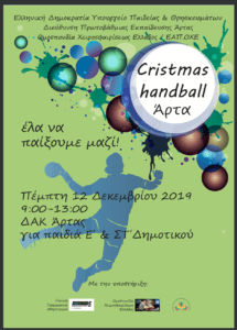 Το Υπουργείο Παιδείας και Θρησκευμάτων, η Διεύθυνση Πρωτοβάθμιας Εκπαίδευσης Άρτας και η Ομοσπονδία Χειροσφαιρίσεως Ελλάδος / ΕΑΠ.ΟΧΕ διοργάνωσε το Christmas Handball Άρτας την Πέμπτη 12/12 (9:00-15:00) στο ΔΑΚ Άρτας.