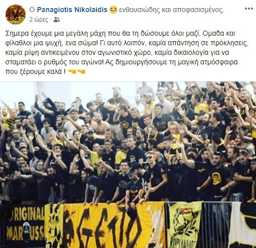 Με ένα μήνυμα στον προσωπικό του λογαριασμό στο Facebook, ο 30χρονος αριστερός ίντερ της  ΑΕΚ Παναγιώτης Νικολαΐδης, απεύθυνε κάλεσμα στον κόσμο της «Ένωσης» να μην απαντήσει σε τυχόν προκλήσεις στο ματς με τον Ολυμπιακό (29/1, 19:00) και να δημιουργήσει παρέα με τους παίκτες του Δημήτρη Δημητρούλια μια μαγική ατμόσφαιρα.