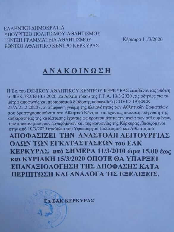 Με ανακοίνωση της η διοίκηση του Εθνικού Αθλητικού Κέντρου Κέρκυρας ενημερώνει ότι αναστέλλεται η λειτουργία του για 1 εβδομάδα, έως 15 του μήνα, μέχρι νεοτέρας!