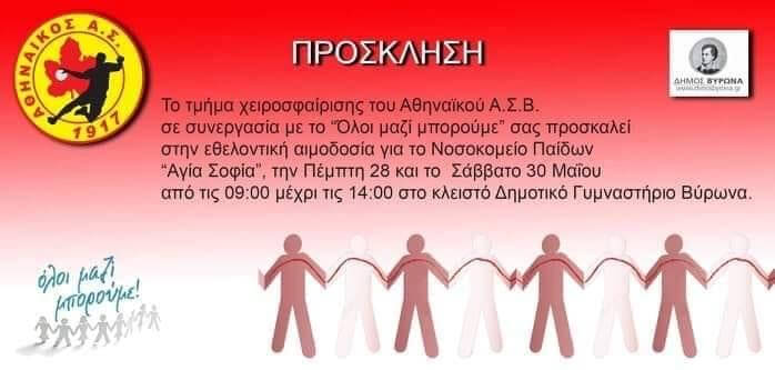 Σε εθελοντική αιμοδοσία για το νοσοκομείο Παίδων «Αγία Σοφία» σας προσκαλεί ο Αθηναϊκός Βύρωνα σε συνεργασία με το «Όλοι μαζί μπορούμε» την Πέμπτη 28 Μαΐου και το Σάββατο 30 Μαΐου από τις 9:00 έως τις 14:00 στο κλειστό Δημοτικό Γυμναστήριο Βύρωνα.