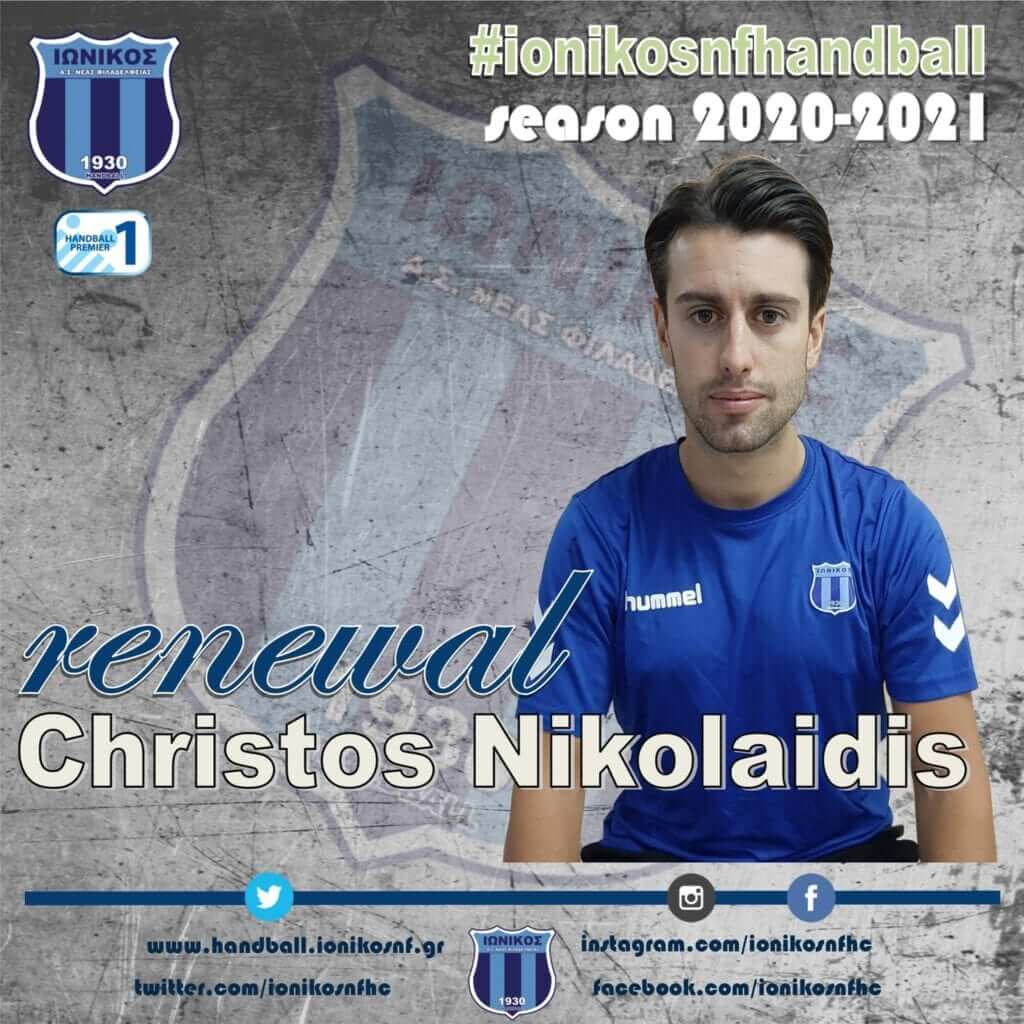 Το τμήμα Handball του Ιωνικού Α.Σ. Νέας Φιλαδέλφειας είναι στην ευχάριστη θέση να ανακοινώσει την ανανέωση συνεργασίας με τον Χρήστο Νικολαίδη για την προσεχή σεζόν 2020-2021 . Ο Χρήστος ήρθε στην ομάδα μας στην μεταγραφική περίοδο του Ιανουαρίου αλλά ήδη αισθανόμαστε οτι είναι κοντά μας πολύ καιρό αφου έχει αφομοιώσει πλήρως την φιλοσοφία του συλλόγου μας . Στις 9 συμμετοχές του με την κυανόλευκη φανέλα σημείωσε 11 γκολ (1,22 μ.ο) .