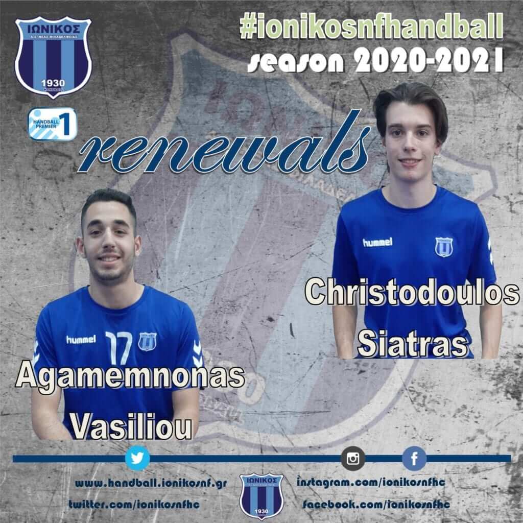 Το τμήμα Handball του Ιωνικού Α.Σ. Νέας Φιλαδέλφειας είναι στην ευχάριστη θέση να ανακοινώσει την ανανέωση συνεργασίας με τους νεαρούς αθλητές μας , Χριστόδουλο Σιάτρα και Αγαμέμνονα Βασιλείου για την προσεχή σεζόν 2020-2021 .