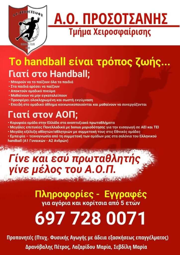 «Το handball είναι τρόπος ζωής» είναι το μήνυμα της Προσοτσάνης η οποία καλεί τα παιδιά από 5 ετών να συμμετάσχουν στον Α.Ο.Π.