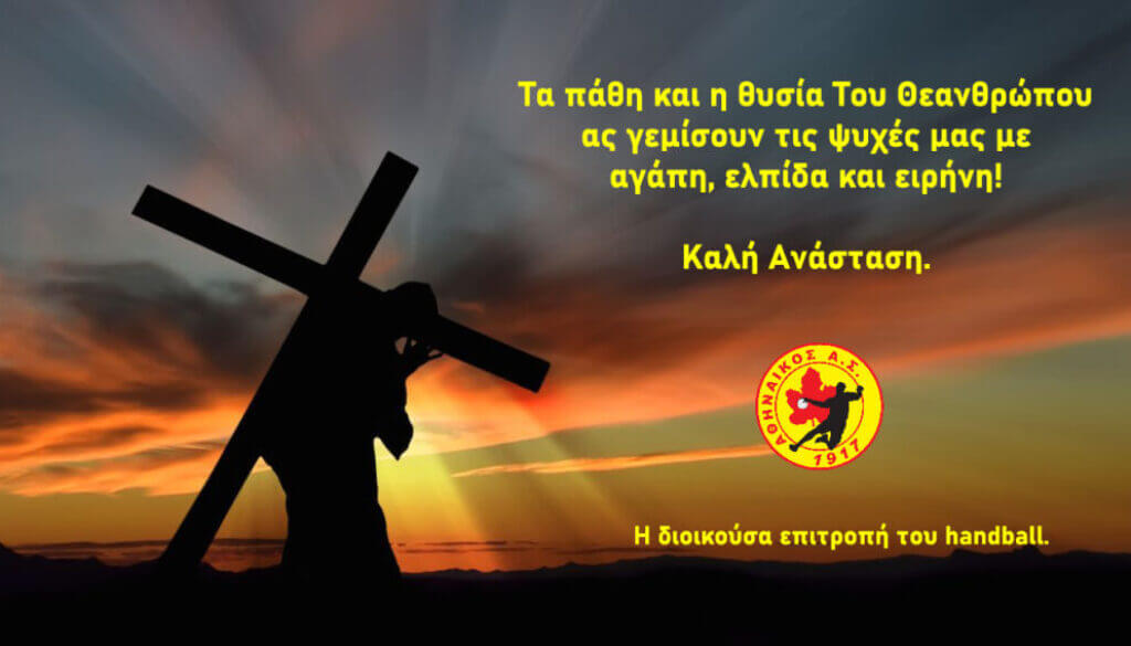 Η Διοικούσα επιτροπή του τμήματος Handball του Αθηναϊκού Α.Σ. Βύρωνα σας εύχεται καλό Πάσχα και ότι καλύτερο σε εσάς και τις οικογένειές σας! Ευχή και αίσθηση ότι σύντομα θα ανταλλάσσουμε ευχές στα γήπεδα…..