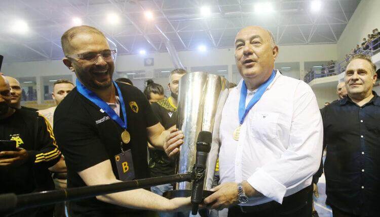 Θεωρώ ότι το τρεμπλ είναι ένας στόχος εφικτός. Η ιστορία θα γράψει αυτό που πρέπει αλλά η δική μου δουλειά δεν είναι τι θα πει η ιστορία, ίσως στο μέλλον να το σκεφτώ. Εμένα πάντα η επίτευξη η χθεσινή μου δημιουργεί την ανάγκη να σκεφτώ την στρατηγική ώστε να κεφαλαιοποιήσουμε αυτή την προσπάθεια. Έχουμε πράγματα μπροστά μας. Το κυριότερο το γήπεδο. Δεν είναι δυνατόν η ΑΕΚ να παίζει ευρωπαϊκό και να πάει στη Χαλκίδα. Καλά να είναι οι άνθρωποι αλλά υπάρχει ένα Γαλάτσι και έχει γίνει μουσική σκηνή.  Να πείσουμε την Πολιτεία στα έργα και όχι στα λόγια ότι πρέπει να γίνουν γήπεδα χάντμπολ. Καλώς γίνεται γήπεδο για τον Παναθηναϊκό, καλά κάνει και ο Ολυμπιακός με το Μελίνα Μερκούρη αλλά δεν γίνεται η ΑΕΚ να πηγαίνει στο Κασιμάτης να δίνει ένα σωρό λεφτά και να ψάχνει και πάλι για έδρα.