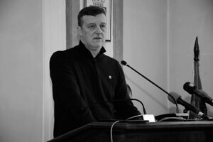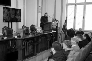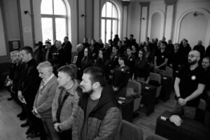Φίλοι και παλιοί συμπαίκτες του, αθλητές και αθλήτριες του Σέρβικου Χάντμπολ, εμφανώς συγκινημένοι παρακολουθούν τους ομιλητές της αποχαιρετιστήριας τελετή ανήμποροι να πιστέψουν ότι το χαμόγελο του Σάσα «έσβησε» ενώ αφήνουν ένα λουλούδι δίπλα στη φωτογραφία του.