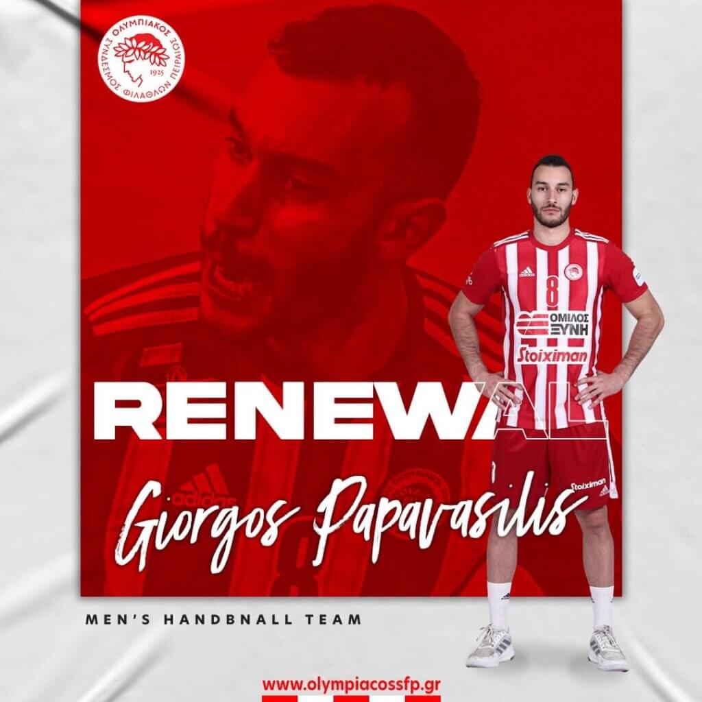Αναλυτικά: «Ο ΟΛΥΜΠΙΑΚΟΣ Σ.Φ.Π. ανακοινώνει την ανανέωση της συνεργασίας του με τον Γιώργο Παπαβασίλη. Ο διεθνής εξτρέμ υπέγραψε το νέο του συμβόλαιο και παραμένει στο ρόστερ της ομάδας χάντμπολ του συλλόγου.