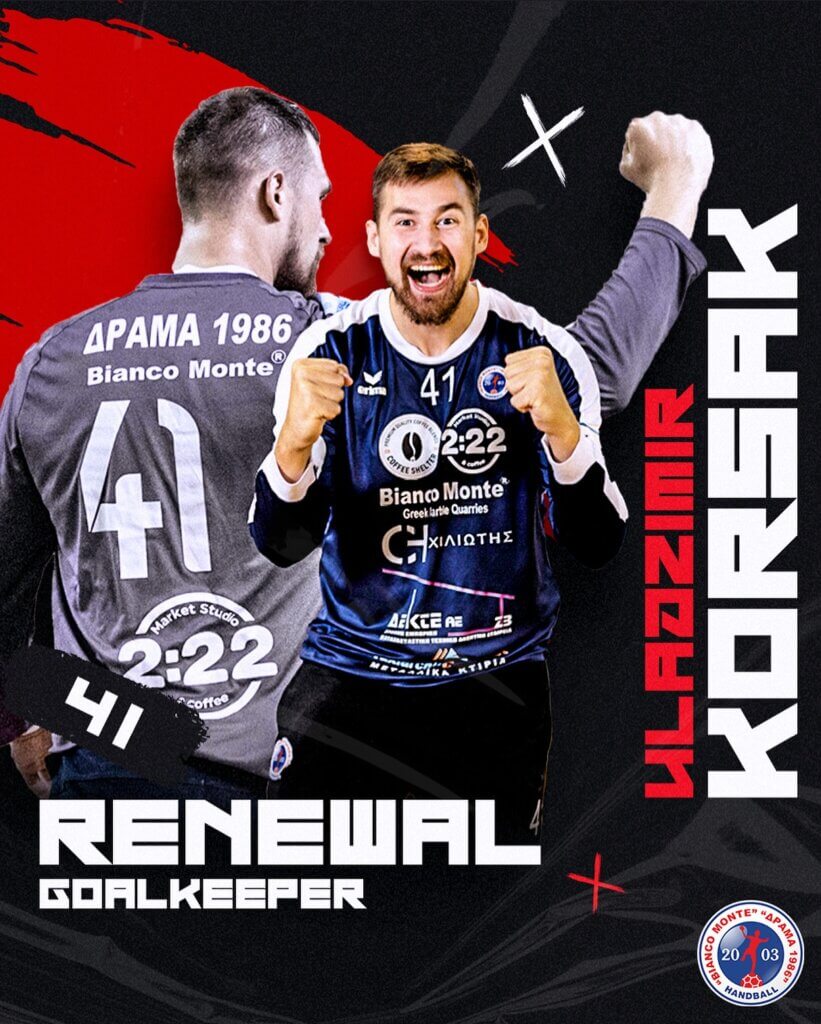 Αναλυτικά: “Ο BIANCO MONTE ΔΡΑΜΑ 1986 ανακοινώνει την ανανέωση της συνεργασίας του με τον τερματοφύλακα ULADZIMIR KORSAK. Ο Διεθνής τερματοφύλακας είναι σημαντικό στέλεχος της πορείας μας τα τελευταία χρόνια, αδαμάντινος χαρακτήρας και όλη η οικογένεια του συλλόγου επιθυμούσε την παραμονή του. Η επιθυμία όλων αλλά και του ίδιου του αθλητή έγινε πραγματικότητα.