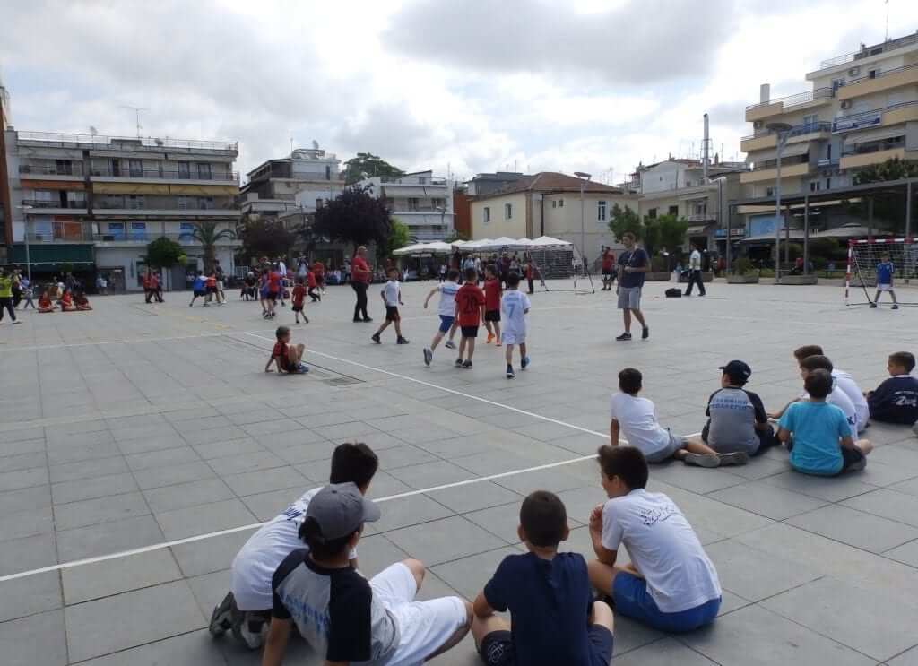 Το πρωί της Κυριακής στο κεντρικότερο σημείο της πόλης, στην πλατεία Αριστοτέλους, το χάντμπολ φοράει τα γιορτινά του.