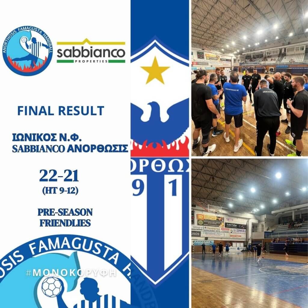 Το πρώτο φιλικό προετοιμασίας επί ελληνικού εδάφους έδωσε τη Δευτέρα (9/9) η Κυπριακή Ανόρθωση με αντίπαλο τον Ιωνικό. Η ομάδα της Νέας Φιλαδέλφειας επικράτησε με 22-21 με τους δυο προπονητές να κάνουν διάφορες δοκιμές σε σχήματα και συστήματα. Η SABBIANCO ΑΝΟΡΘΩΣΙΣ προηγήθηκε στο ημίχρονο με 12-9 και στο δεύτερο ημίχρονο ο Μάριος Ευσταθιάδης έκανε πολλές […]