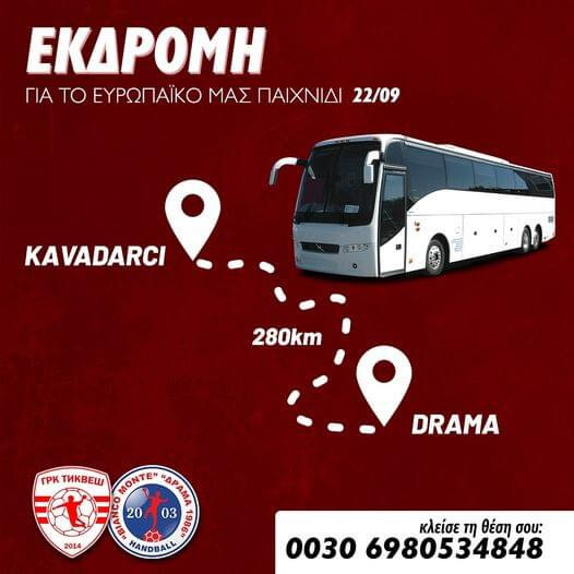 Εκδρομή στο Kavadarci διοργανώνουν οι φίλαθλοι της Δράμας για την ρεβάνς του Ευρωπαϊκού παιχνιδιού με την Τίκβες.  Στο πρώτο παιχνίδι οι Δραμινοί πήραν την νίκη με σκορ 31-27. Το παιχνίδι εκεί θα γίνει την Κυριακή 22/9 στις 19:00 (20:00 ώρα Ελλάδας). Η απόσταση από την Δράμα είναι 280 χιλιόμετρα, περίπου 4 ώρες. Η αναχώρηση από […]
