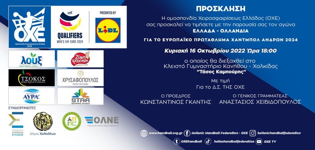 Η Εθνική μας ομάδα των Ανδρών θα αντιμετωπίσει την Ολλανδία για τα προκριματικά του ΕURO 2024 στο κλειστό γυμναστήριο Κανήθου- Χαλκίδας την Κυριακή 16 Οκτωβρίου 2022 και ώρα 18:00 Η στήριξη της οικογένειας του αθλήματος στην Εθνική μας ομάδα είναι αναγκαία και πολύτιμη και για αυτό τον λόγο σας ζητούμε να σταθείτε στο πλευρό της […]